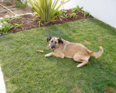This is me with a hide bone; my Dad is putting another lawn in for me.